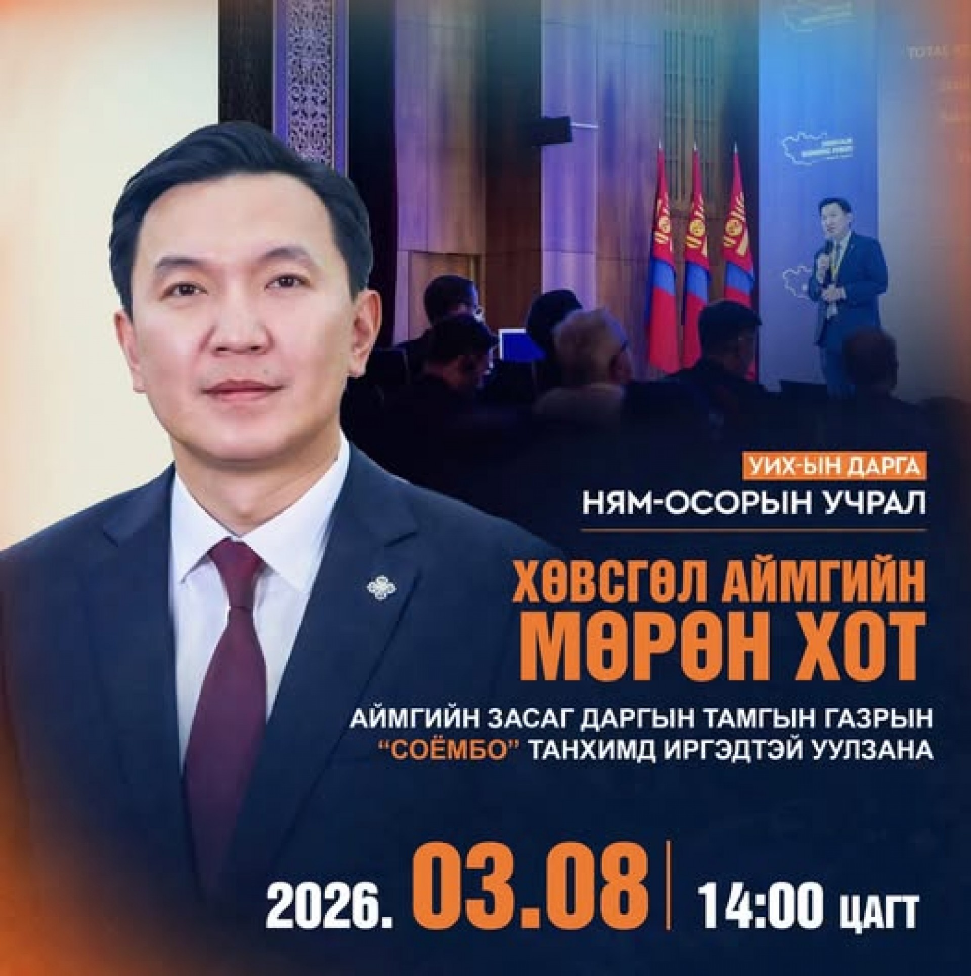 Монгол улсын УИХ-ын дарга Ням-Осорын Учрал Хөвсгөл аймгийн иргэдтэй уулзалт хийнэ. Уулзалт 2026.03.08-нд аймгийн Засаг даргын Тамгын газрын "Соёмбо" танхимд 14:00 цагт болно.